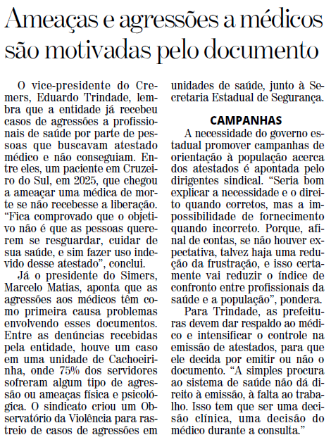 14 jan Ameaças e agressões a médicos são motivadas pelo documento Posted at 14:37h in by Vitória Vargas 0 Comments 0 Likes Ameaças e agressões a médicos são motivadas pelo documento Publicado em 14 de janeiro de 2026 Fonte: Correio do Povo