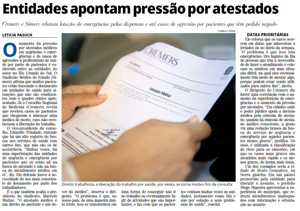 14 jan Entidades apontam pressão por atestados Posted at 15:11h in by Vitória Vargas 0 Comments 0 Likes Entidades apontam pressão por atestados Publicado em 14 de janeiro de 2026 Fonte: Correio do Povo