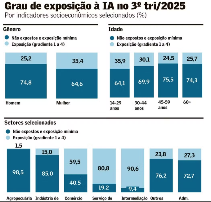 Os pesquisadores cruzaram a análise com outros indicadores socioeconômicos (ver detalhes ao lado). Em termos de gênero, o grau de exposição das mulheres (35,4%) é maior que dos homens (25,2%). A região com maior exposição é a Sudeste (32%), e a com a menor é o Norte (25,3%), seguida do Nordeste (26,7%). A exposição à IA é decrescente com a idade, sendo maior entre jovens de 14 a 29 anos (35,9%) e menor nas faixas de 45 a 59 anos (24,5%) e de 60 anos ou mais (25,7%).