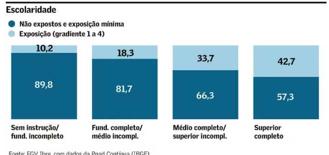 No caso da escolaridade, o grau de exposição à IA é crescente, saindo de 10,2% para aqueles sem instrução ou com fundamental incompleto para 42,7% entre os com superior completo.