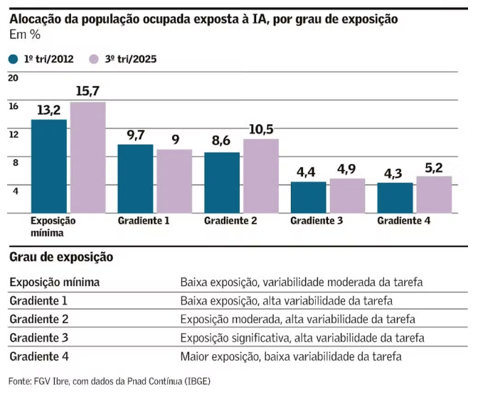 Os pesquisadores do instituto calculam que 29,8 milhões de trabalhadores, ou 30% dos empregados, tinham exposição à IA generativa no terceiro trimestre de 2025, último dado disponível da Pnad Contínua trimestral, do IBGE. Em 2012, esse contingente era de 23,2 milhões de pessoas, ou 27% da população ocupada. Essa exposição à IA pode ser positiva, isto é, complementar ao trabalho convencional, ou negativa, quando leva à substituição completa do trabalhador.